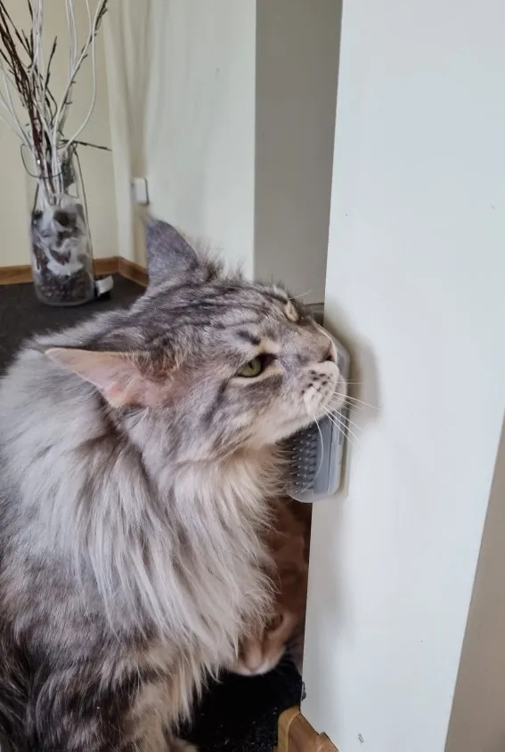 Szczotka super, uspakaja kota, ładnie wyczesuje, na początku się z nią zaznajomił, powąchał, chyba polubił.